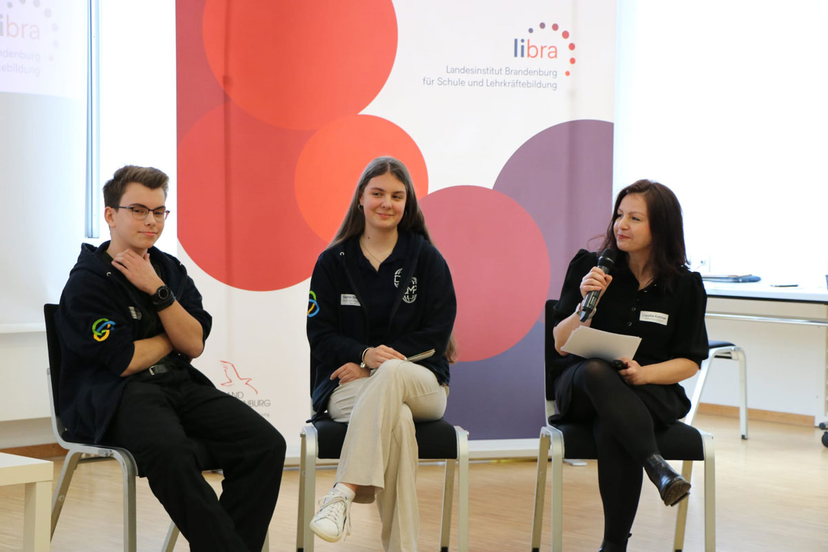 Nach der freundlichen Begrüßung durch den Veranstalter nahmen wir gemeinsam mit Frau Kuttner und den Medienscouts des Jahngymnasiums Rathenow an einer spannenden Podiumsdiskussion teil. Dabei gaben wir einen Einblick in unsere Arbeit als DMP. Es wurden uns Fragen zum Aufbau, zur Struktur und zur Entwicklung unseres Projekts gestellt. Besonders interessierten sich die Teilnehmenden für Schwierigkeiten, die es bei uns gab, und dafür, wie wir unseren Weg bisher gegangen sind – zum Beispiel: „Wo hatten wir Unterstützung?“, „Wie viele Medienscouts braucht es für den Start?“, „Welche Hürden gab es?“ oder auch „Wie schaffen wir Medienscouts, unser Projekt gemeinsam mit der Schule zu stemmen, ohne dabei überfordert zu sein?“