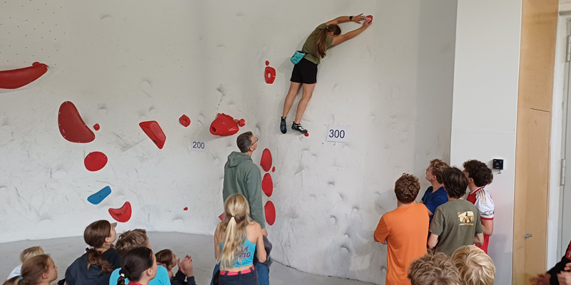 Vorangegangen waren zwei Stunden Kletterei an kniffligen Problemen, bei denen die vier fleißig Punkte sammeln konnten. Nach einer kurzen Pause mit Tee, Suppe und ein paar Snacks ging es dann ins Finale.